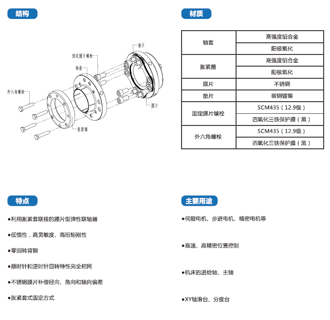 DFP-T系列聯(lián)軸器采用高強度鋁合金材料,經(jīng)過陽極氧化處理,廣泛用于伺服電機、步進電機、精密電機等。