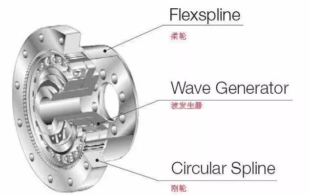 諧波減速機由“柔輪、波發(fā)生器、剛輪、軸承”這四個基本部件構成。柔輪的外徑略小于剛輪的內徑,通常柔輪比剛輪少2個齒。波發(fā)生器的橢圓型形狀決定了柔輪和剛輪的齒接觸點分布在介于橢圓中心的兩個對立面。波發(fā)生器轉動的過程中,柔輪和剛輪齒接觸部分開始嚙合。波發(fā)生器每正時針旋轉180°,柔輪就相當于剛輪逆時針旋轉1個齒數(shù)差。在180°對稱的兩處,全部齒數(shù)的30%以上同時嚙合,這也造就了其高轉矩傳送。